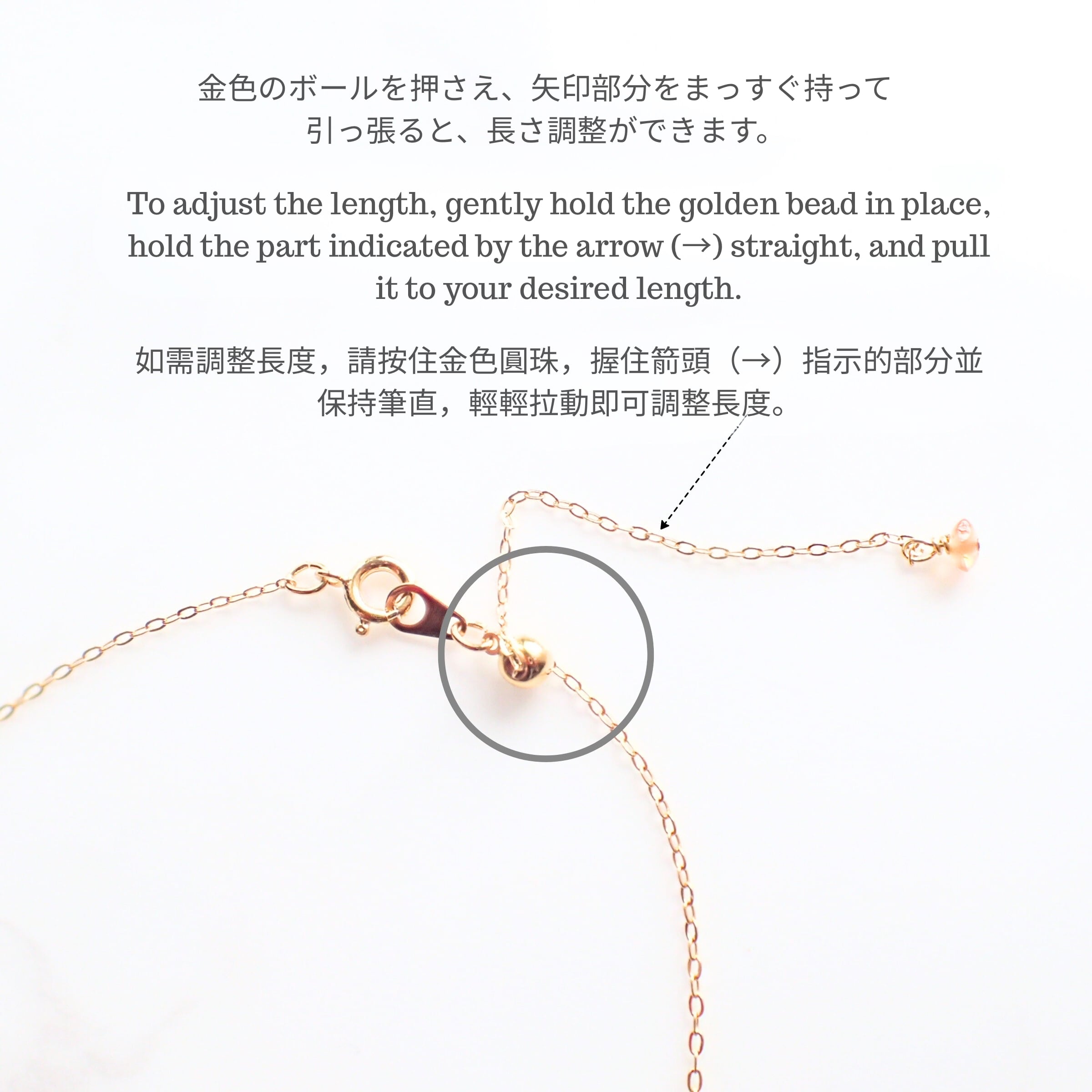 金色のボールを手で押さえ、チェーンの先端パーツを持ち、まっすぐにしてチェーンを引っ張ると、長さ調整ができます。